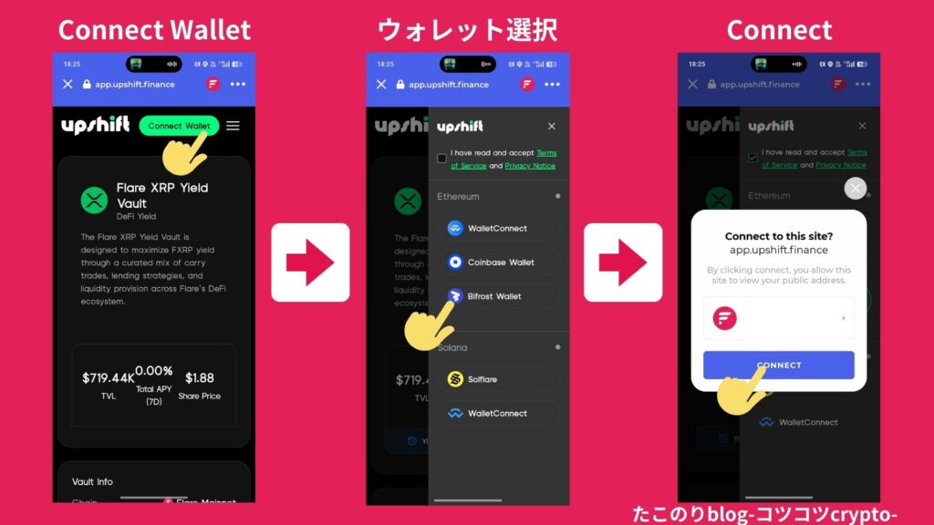 準備ができたら、「Upshift」にアクセスしてウォレットにコネクトしましょう。