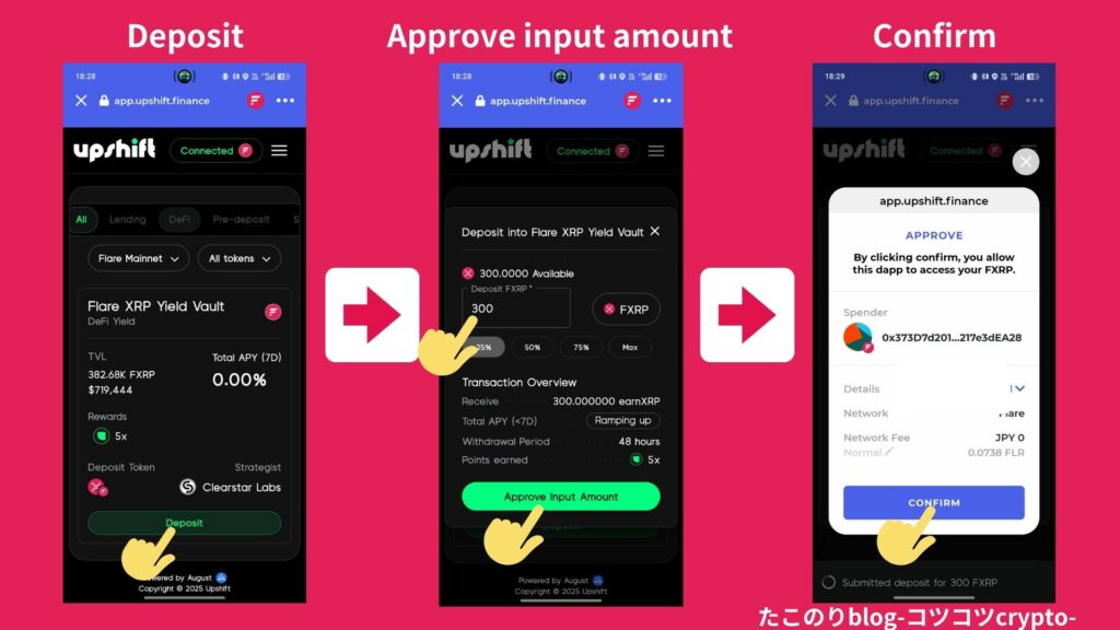 あとは、デポジットボタンを押し預けるFXRP数量を選択しウォレットで認証するだけです。