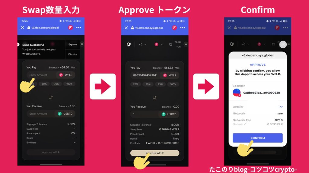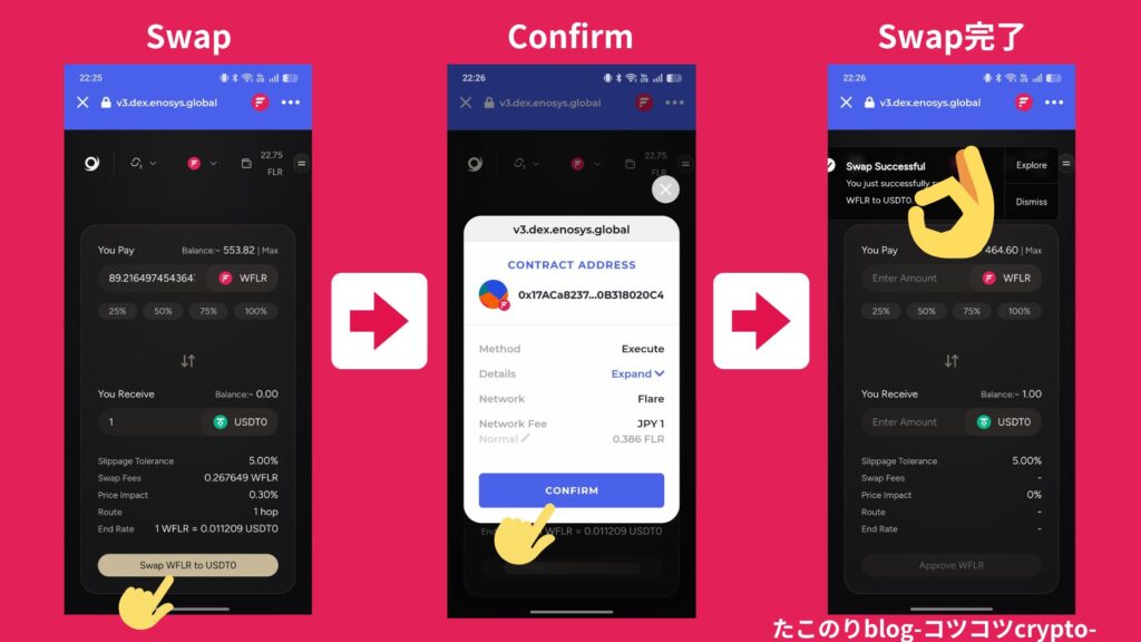 FlareNetworkのDEX、「Enosys」でのトークンSwap(交換)方法について解説しました。