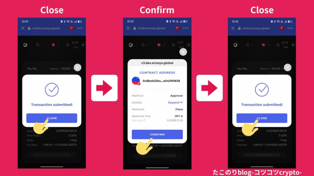 • Approve(承認)の場合: 初めて売却するトークン(FLR以外)の場合、最初に「Approve」ボタンが表示されます。これを押してウォレットで承認した後、改めて「Swap」ボタンを押してください。