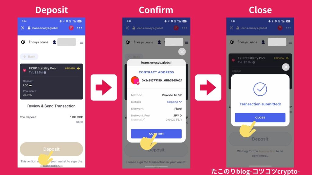 CDPが用意できたら、「Enosys Loans」の担保プールにCDPをデポジット(預け入れ)してみましょう!