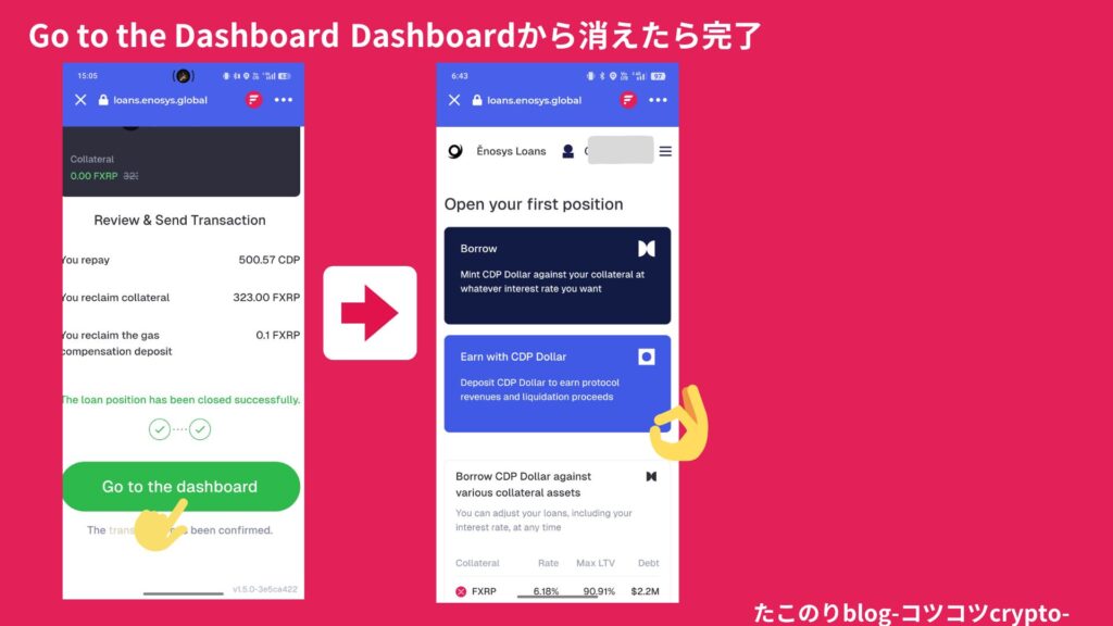 ダッシュボードから消えたら借入返済が完了となります。(CDP残高がなくなる)