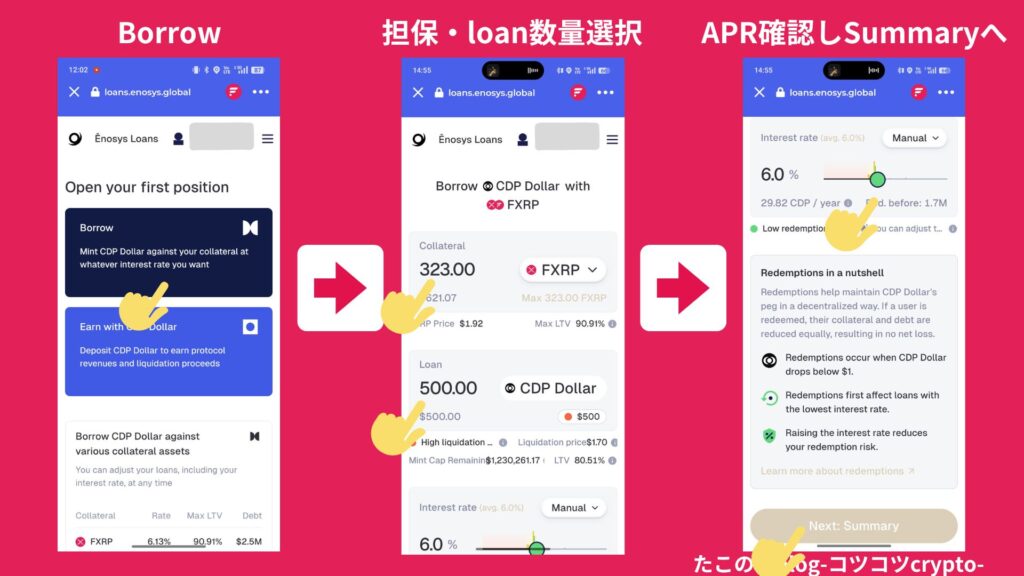 では、実際に「Enosys Loans」でCDPを借入(ミント)し運用するやり方を見ていきましょう!