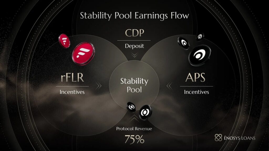 この手数料収入を「Enosys Loans」内のFXRPまたはFLRの担保プールにCDPを預けた方に配分する仕組みとなっています。
