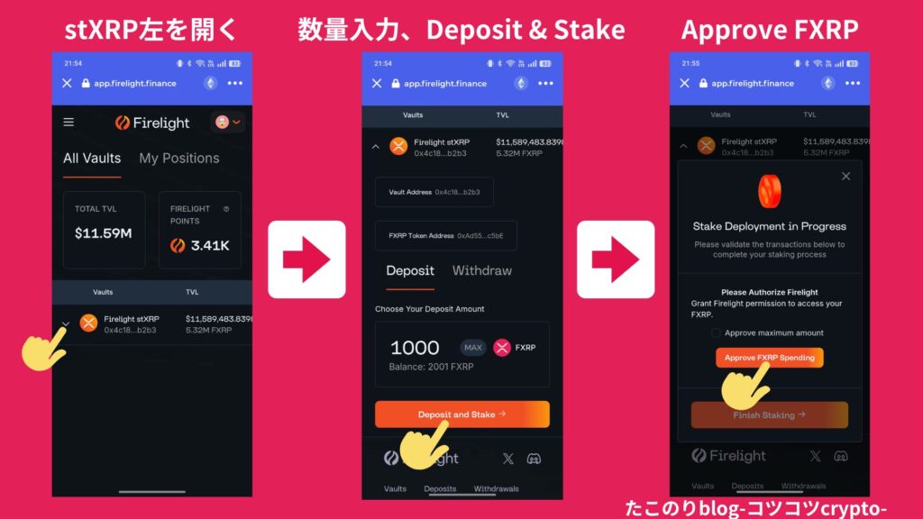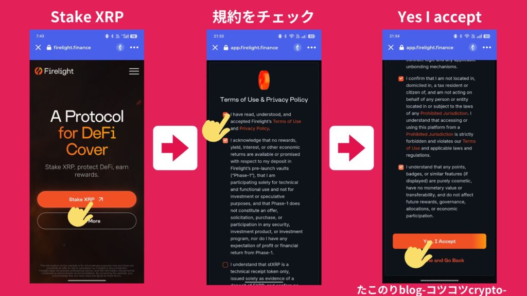 では、実際に「Firelight」でXRPステーキングのやり方を見ていきましょう!