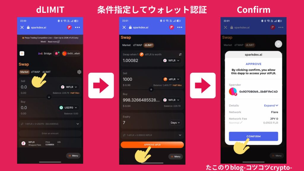 「SparkDEX」で、ただ今すぐ交換するだけでなく、指値機能なども充実しています!